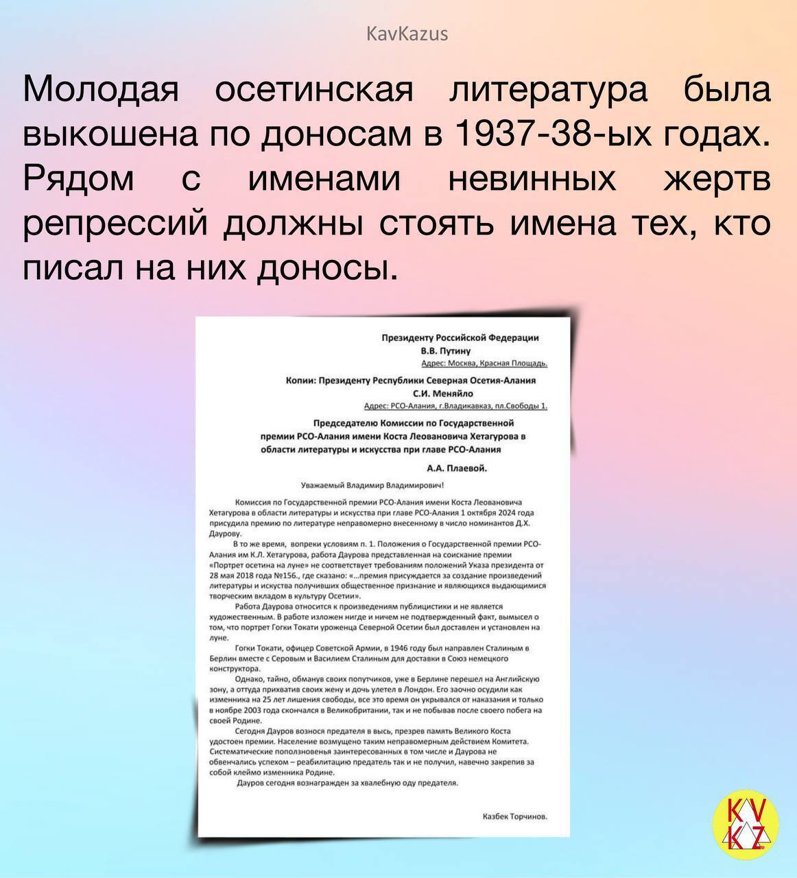 Автор письма - другой соискатель премии Казбек (Мелс) Торчинов: "Дауров сегодня награждён за хвалебную оду предателю", - говорится в его письме, полный текст которого можно прочесть ниже.