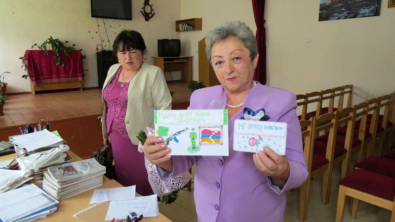 Ромелла Арустамян показывает письма (сочинения) пятиклассников солдатам АО НКР, находящимся на передней линии. Во всех сочинениях дети пишут о мире...