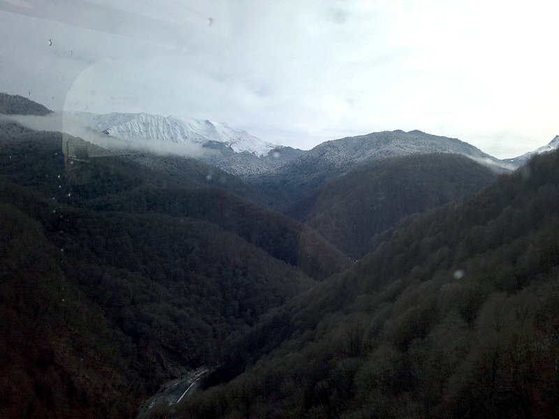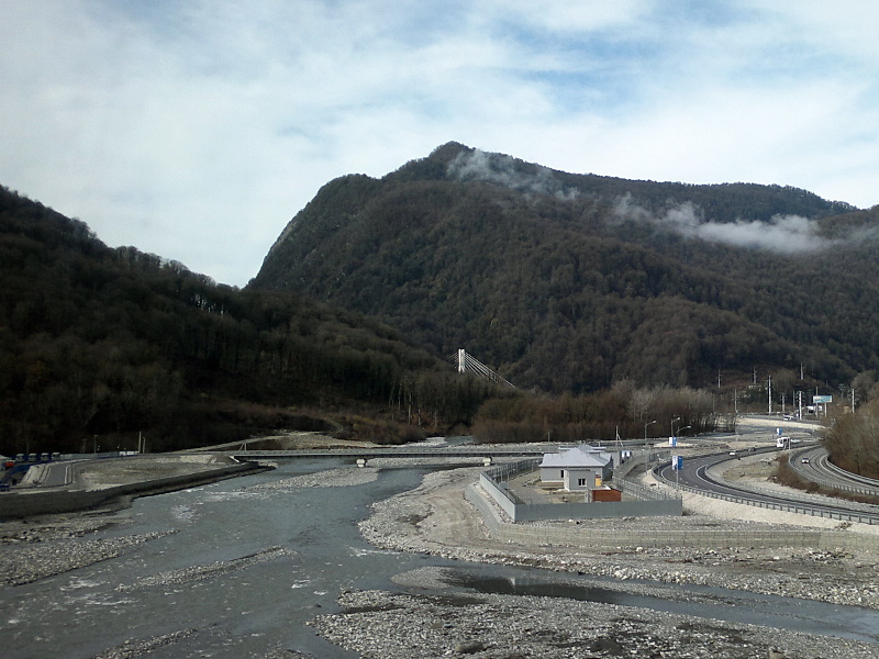 Вид из окна электропоезда «Ласточка» на участок совмещенной скоростной автомобильной и железной дороги Адлер - Красная Поляна, построенной к Олимпиаде.