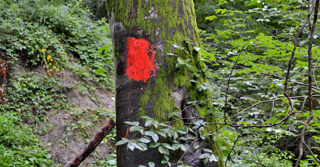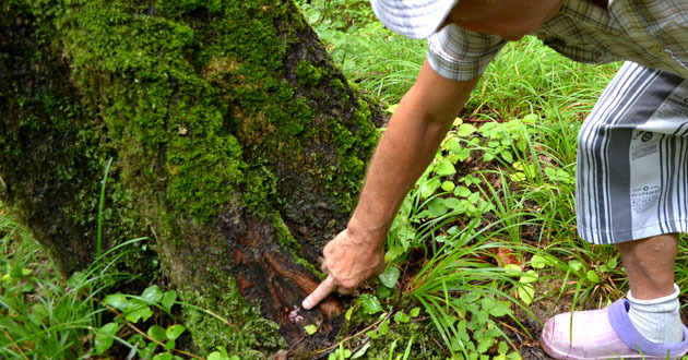Житель поселка Шаумяновка показывает номера на корнях деревьев предназначенных к рубке