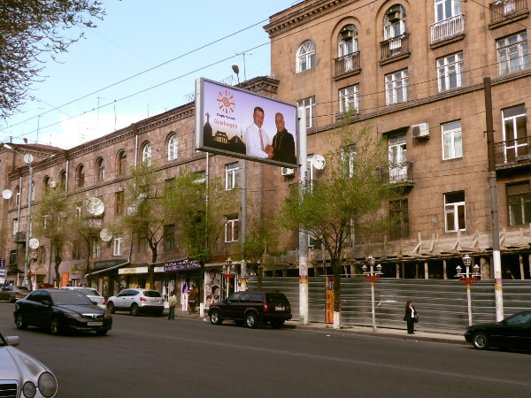 Надписи на плакатах: «Лишим РПА голосов от Еревана», «Тарон, ты будешь осужден», «Освободите общественные места от Мишиков», «Хочешь вновь стать мэром? Для чего?».