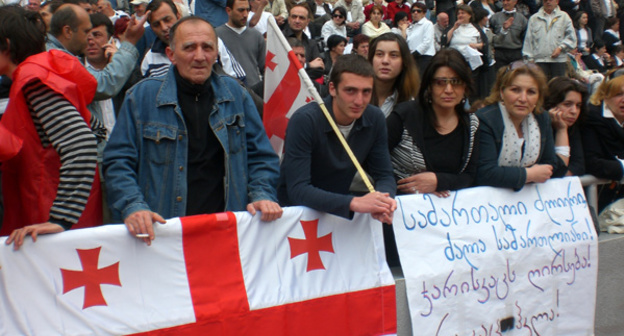 В Тбилиси более ста тысяч человек собрались на организованный оппозицией "гражданский парад", до отказа заполнив стадион имени Бориса Паичадзе. Съемка 2009 г.