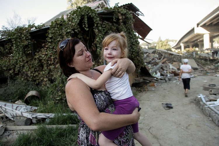 На фото, Татьяна Самохвал с дочкой Катей, во время сноса дома ее семьи, который попал в зону Олимпийского строительства. Сейчас на месте дома пустырь, под которым проложена теплотрасса к гостиницам Олимпийского парка. Компенсацию ни за дом, ни за землю, семья Татьяны Самохвал не получили. 19 августа 2012 г.